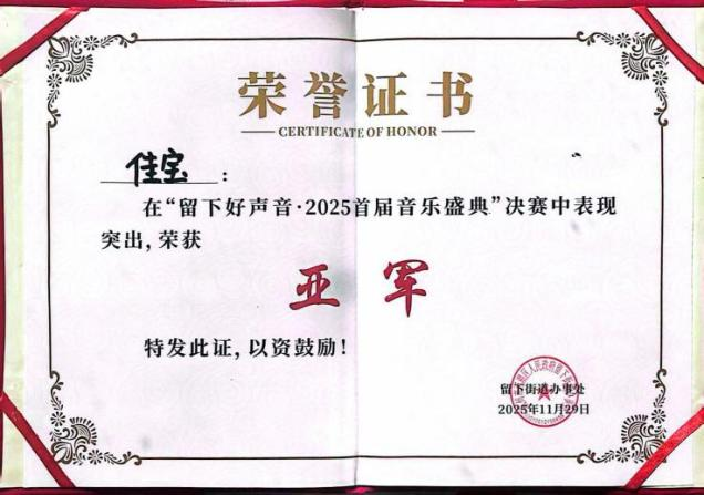 这场由留下街道党工委、办事处主办,杭州人民广播电台西湖之声承办的全民文化 IP 赛事,经海选、初赛、复赛筛选,最终有10 位选手晋级总决赛。佳宝以独特的歌声征服评委观众,更与其他十强选手获 “留下街道文化志愿者” 聘书,成为社区文化交流新力量。
