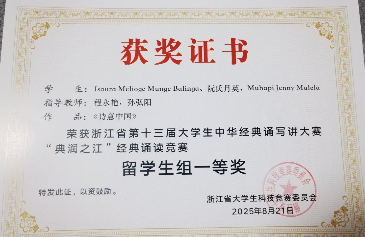 该项赛事由浙江省教育厅等单位主办,旨在引导大学生亲近中华经典。国际教育学院不仅在组织与选拔环节精心筹划,更在备赛过程中为学生提供了全方位的指导与资源支持,为学子们取得优异成绩奠定了坚实基础。
