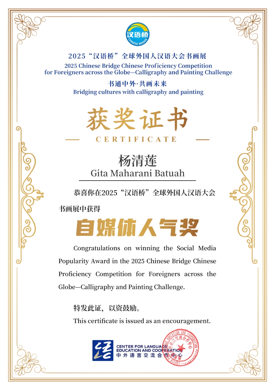同月,在“汉语桥”全球外国人汉语大会书画展中,来自印度尼西亚的杨清莲同学,其作品《冰雪覆盖的张家界》在激烈的竞争中脱颖而出,荣获自媒体人气奖。本次展览以“书通中外,共画未来”为主题,吸引了全球83国家的858位中文爱好者参与,共收到908份作品。经过专业评审与大众投票,最终评选出62位获奖者。