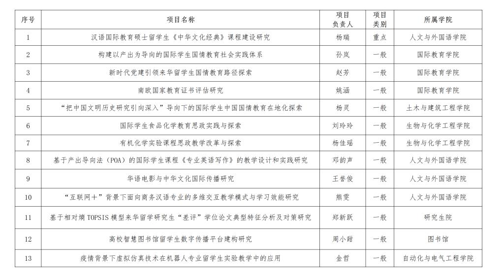 根据《关于做好浙江科技大学2025年度国际教育研究专项课题结题工作的通知》的要求,由项目主持人申请并递交结题验收报告、研究成果等结题材料,经研究成果使用(实践)单位验收、专家评审、国际教育研究中心审核,“汉语国际教育硕士留学生《中华文化经典》课程建设研究”等13项国际教育研究专项课题已完成研究,拟予以结题,现公示如下: