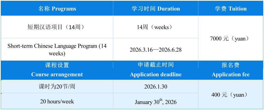 B.短期汉语项目(14周)Short-term Chinese Language Program (14 weeks)