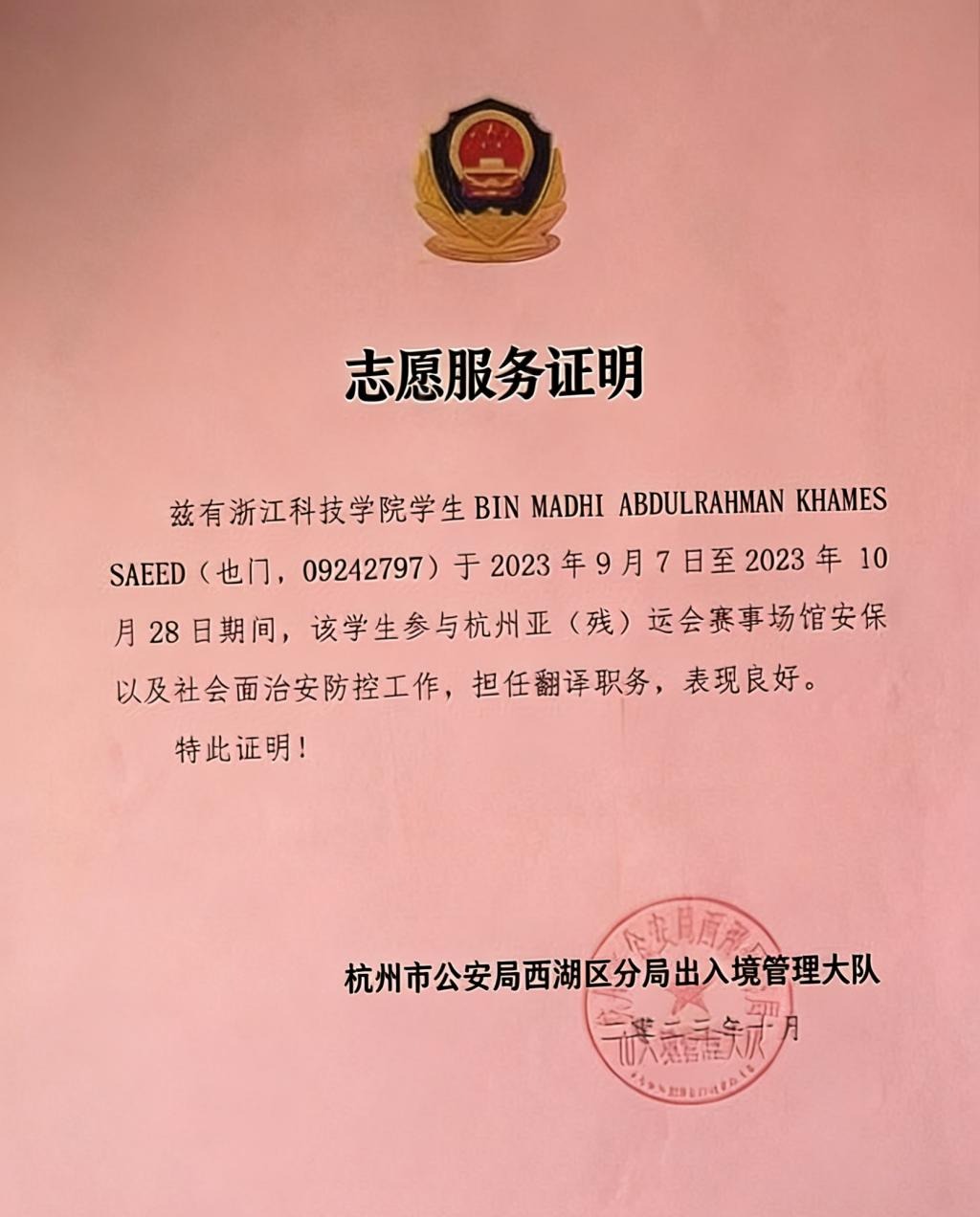 除了专业学习与竞赛,我也积极投身各类跨文化志愿服务,在奉献中传递温暖。2023年杭州亚(残)运会期间,我担任翻译专员,精准对接多语种沟通需求,一边协助安保团队完成涉外指令传达、外籍人员沟通协调工作,一边为外国游客提供引导服务,及时解决他们遇到的各类问题,成为安保人员与外国游客之间顺畅沟通的纽带。而在2024年国际教育学院迎新晚会上,我作为唱歌队的一员,和伙伴们共同合唱《微风拂过我们》,用和谐的歌声为来自五洲四海的新生送上祝福,也为晚会《初遇・四海和声起》篇章增添了一抹青春韵味。